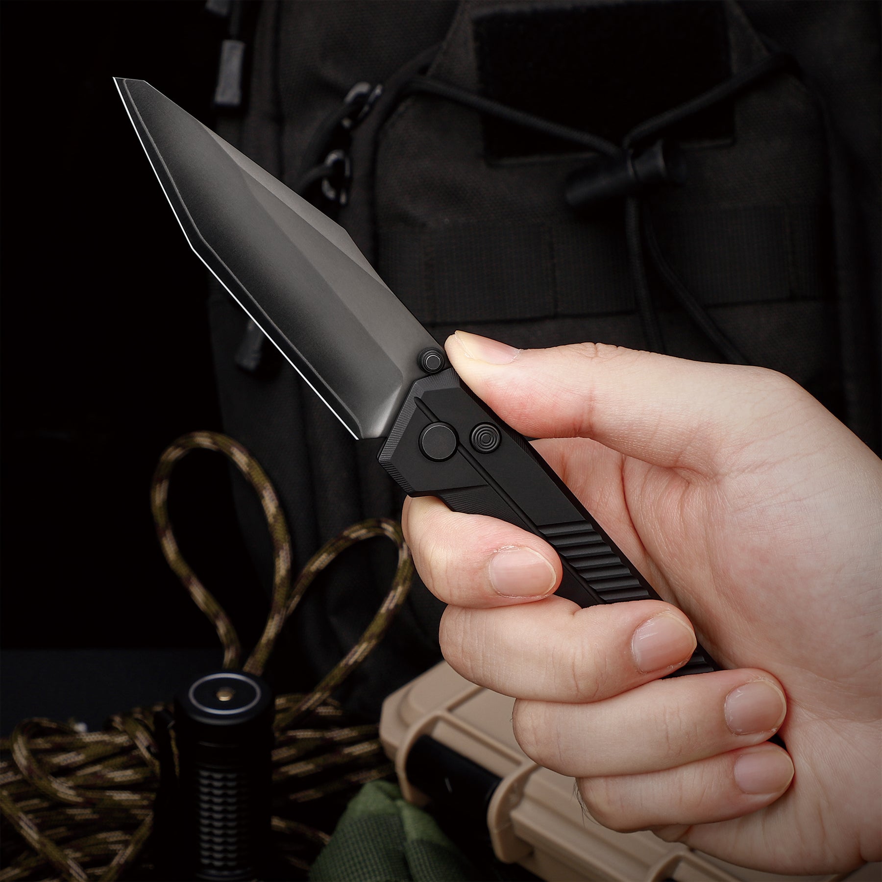 Featuring both a secure button‑lock mechanism and a responsive thumb‑stud opener, the TIRAN enables fast one‑handed deployment and closure—delivering maximum safety without sacrificing convenience. -